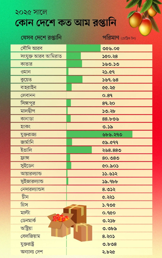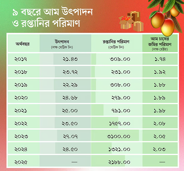 ২০২৩ সালে ৩ হাজার ১০০ টন, ২০২৪ সালে ১ হাজার ৩২১ টন, এবার ২ হাজার ১৮৮ টন আম রপ্তানি হয়েছে।
