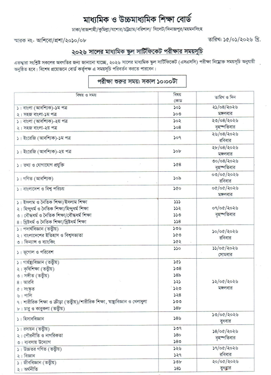 ২০২৬ সালের মাধ্যমিক স্কুল সার্টিফিকেট (এসএসসি) ও সমমানের পরীক্ষা আগামী ২১ এপ্রিল থেকে শুরু হবে।