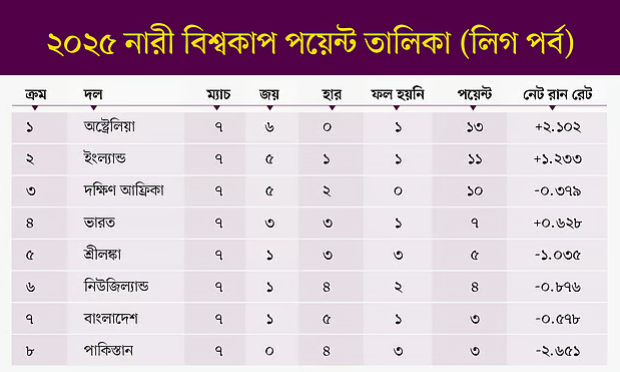 গত ৩০ সেপ্টেম্বর ৮ দল নিয়ে শুরু হওয়া নারী বিশ্বকাপে বাংলাদেশ-ভারতের খেলাটিই ছিল লিগ পর্বের শেষ ম্যাচ। পয়েন্ট ভাগাভাগি হয়ে যাওয়ার পর পুরো টুর্নামেন্টের যে পয়েন্ট তালিকা দাঁড়িয়েছে, তাতে বাংলাদেশের অবস্থান সপ্তম। সবার শেষে থাকা পাকিস্তান দলের চেয়ে একধাপ এগিয়ে থাকার কারণ জয়সংখ্যা। বাংলাদেশ ও পাকিস্তান দুই দলের পয়েন্টই ৩ করে। তবে পাকিস্তান সব কটি পেয়েছে বৃষ্টিতে পণ্ড হয়ে যাওয়া ম্যাচ থেকে পয়েন্ট ভাগাভাগির সুবাদে। আর বাংলাদেশ একটি ম্যাচে জিতেছিল, সেটা ওই পাকিস্তানের বিপক্ষেই।