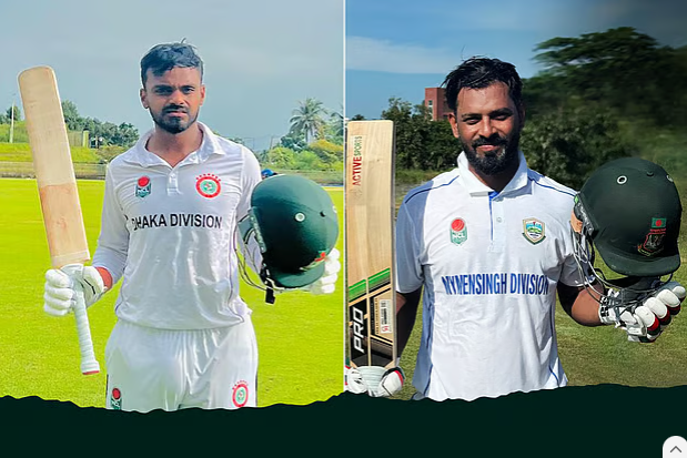 জাতীয় ক্রিকেট লিগে সেঞ্চুরি পেয়েছেন ঢাকা বিভাগের মাহিদুল ইসলাম (বাঁয়ে) ও ময়মনসিংহ বিভাগের আবদুল মজিদবিসিবি